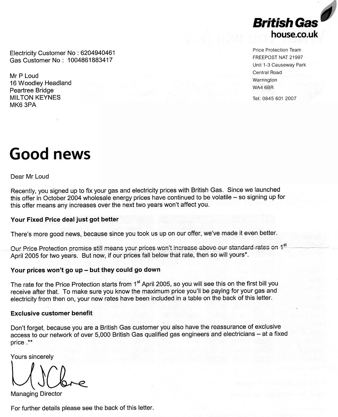 This fraud started with an undated letter that I received in March 2005. As I said earlier I had neither requested nor signed up for any fixed price gas and electricity prices deal. As prices had risen just before this letter I thought that it was unlikely that there would be another rise in the near future, therefore there was no point in paying the higher unit energy prices under such a deal. I was also angry that British Gas claimed that I had signed up for such a deal when I had not. To make sure there was no misunderstanding about this I rang British Gas, in reply to this letter, on 24 March 2005 emphatically telling them that I had not signed up to fix my gas and electricity prices and that I did not want a fixed prices agreement. Correspondence with British Gas Most, but not all, of the correspondence between British Gas and me is shown in full in a 5MB pdf file, by clicking here you can open it in a separate window and cross-check every thing I claim. When you read these documents bear in mind that on 31st August 2006 British Gas eventually admitted, "With regard to the Price Protection packages . . . , you did not sign or register for this agreement". This means that at the same time as B.G. were being evasive, lying and making threats of court actions and debt collectors they knew all along that there never had been any agreement. So let's go through the statements made by British Gas about my having a fixed energy prices agreement with them. M J Clare(?), Managing Director, wrote to me in an undated letter in March 2005. "Dear Mr Loud Recently, you signed up to fix your gas and electricity prices with British Gas." - No I hadn't signed up for anything! I wonder, is this guy the baddie who started off these falsified agreements? Will Napier, Customer Relations, wrote to me in an letter dated 30 May 2006. "Regarding the charges for capped price energy, there is a note on your account dated 21 February 2005 which stated that there was a pre-registered application for capped prices until 2007." - I hadn't pre-registered for anything. There might have been a note, but I'd had nothing to do with it's creation. Barrie Caird, Senior Customer Liaison Manager, emailed to me on 4th June 2006. "With regard to the monies you were charged for the cancellation of a contract, I am sorry that you think we have falsified a contract with you, however can confirm that we have all necessary paperwork relating to the contract which you agreed with us around 21 February 2005." - I can confidently call this guy a li**. I had not agreed to any such contract so he could not possibly have all the neccessary paperwork. I repeatedly asked him to send me a copy of this paperwork. I got a load of bullsh** about Data Protection and was sent a form telling me I'd have to pay £10 to British Gas to get a copy of the agreement. After I contacted Ofgem, who contacted Energywatch, who contacted British Gas Will Napier, Customer Relations, wrote to me in an letter dated 14th July 2006. "I also understand that you have requested further information regarding the notes on your account that refer to this price protection agreement. These notes were system generated and were intended for the general information of any individual who was required to perform maintenance on your account. Please find below the full content of the notes: Fixed Price Gas - Customer has pre-registered for this offer which fixes prices until 1st April 2007. The customer needs to take no further action at present. Both the customer and customer contact will be updated as to when the offer will commence. Check notes on customer's electricity account to see if customer has also pre- registered for Fixed Price Electricity. Fixed Price Electricity - Customer has pre-registered for this offer, which fixes prices until 1st April 2007. The customer needs to take no further action at present. Both the customer and customer contact will be updated as to when the offer will commence. Check notes on customer's gas account to see if customer has also pre- registered for Fixed Price Gas. These notes were both placed on the respective accounts on 21 February 2005. In the e-mail you received form my colleague Barrie Caird, these notes were paperwork to which he referred, as these are taken as confirmation that the offer has been agreed to." - Ahh, Good Old Will Napier, a wily guy but not a liar. So Will seems to be saying that the note that claimed that I had an agreement with British Gas was a note British Gas generated on their own computer for their own use. By implication this must mean that it was generated without any request, signature or agreement from me. Which means there was no agreement between me and British Gas for fixed prices energy. So what was that rubbish from Bulls*** Barrie. Now let's see how this agreement is explained, in a letter dated 2nd August 2006 from Patricia Rant, British Gas Customer Relations. Unfortunately when Barry Caird originally investigated your account he relied on the information stored in the notes on your account. Regarding the Price protection 2007 requests, which would have been received either from our internet site - house.co.uk or our internal electronic form system, Will's letter dated 14 July 2006 states that the 'paperwork' referred to by Barrie Caird is "electronic notes and could have been transposed onto you recount in error". I am therefore unable to send out hard copies of this information as requested. Will also advised that these notes are taken as confirmation that there is an agreement between us. I can also see that this tariff was added to your electricity account on 21 March 2005 and on your gas account on 26 March 2005. . . . . . . and in another letter dated 18 Aug. 2006 from Patricia Rant, British Gas Customer Relations. "Therefore even though you did not actually physically sign for this product an agreement existed electronically." and "I will recall both accounts from the debt collection t