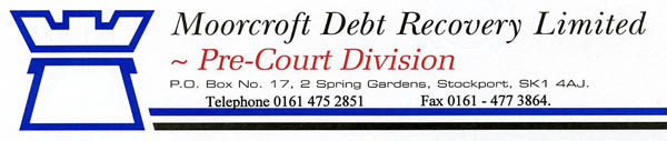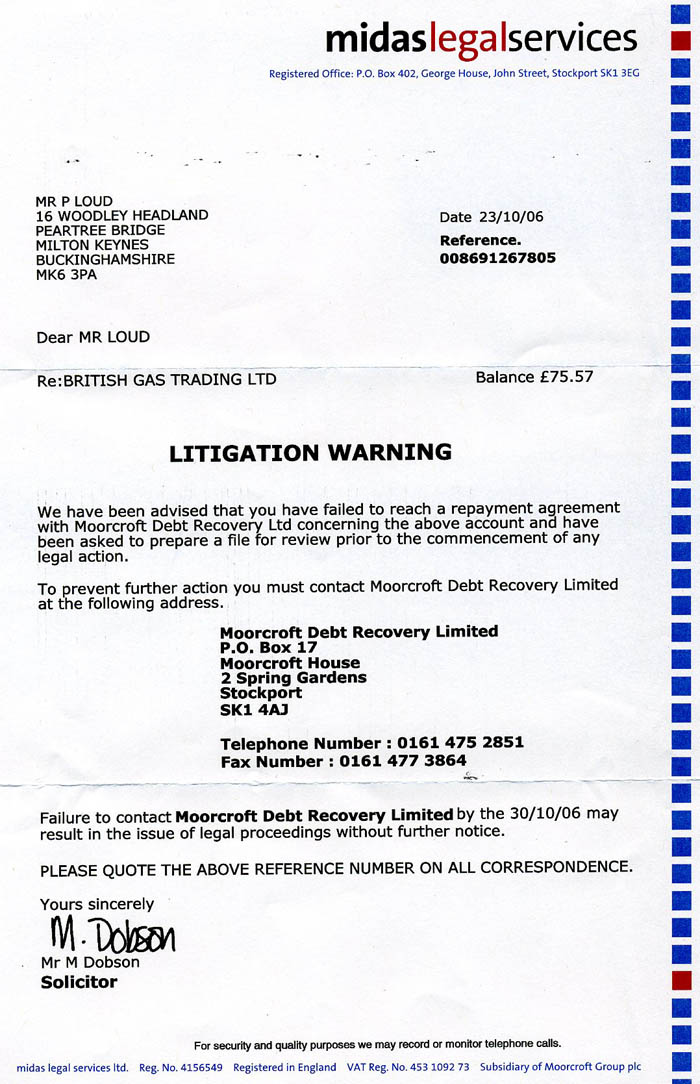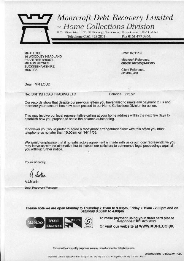 Hi Guys, Ref. Ref. 008691267805(D-PC25) This morning I received a NOTICE OF INTENDED LITIGATION from you. Can you please send me details of this debt. I presume that it is for electricity. Can you let me know how many units were consumed and the price per unit. This is information that you will have to produce in court, it will save time and trouble if you check these figures now. Incidentally, I have irrefutable photographic evidence that the British Gas meter readings were falsified and inflated. I think it is most likely that your case will be kicked out of court and that I will be awarded appropriate costs. I suggest that you refer to my website at, www.peterloud.co.uk/britishgasfraud/ Moorcroft didn't reply to the email but had one of their subsidiaries send another intimidating letter.