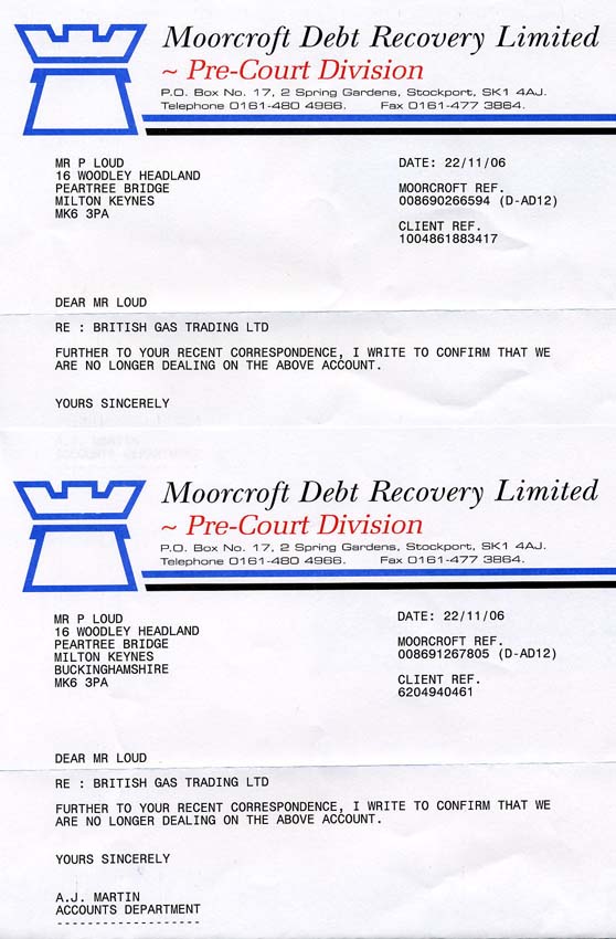 On 4th November I eventually had a letter from British Gas saying that they were cancelling both my gas and electricity bills, but they still continued to harrass me. About a week after that I received what I assume will be the last harassment. Eventually the Moorcroft mercenary bully boys decided to give up.