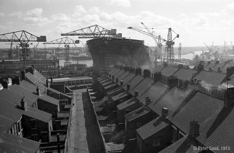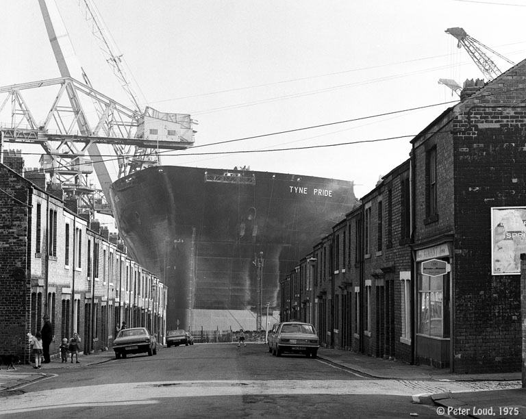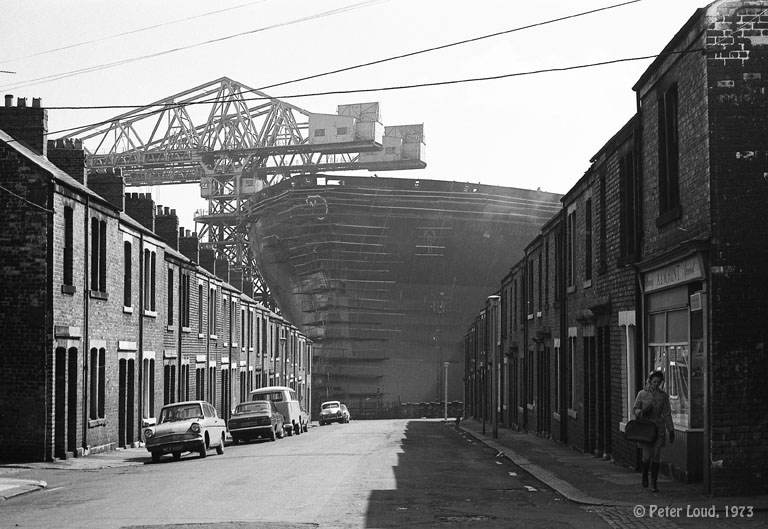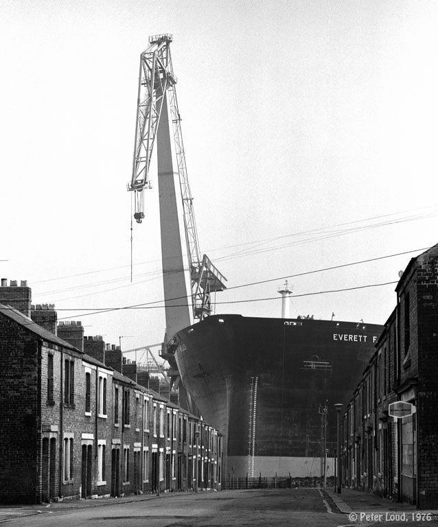 ![]() The End of an Era 250,000 DWT Tanker Everett F. Wells, 1976 This was the last super-tanker built on the Tyne. The shop is boarded up, no kids play in the street, there are no parked cars. Shortly afterwards the houses were demolished. |
