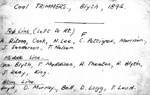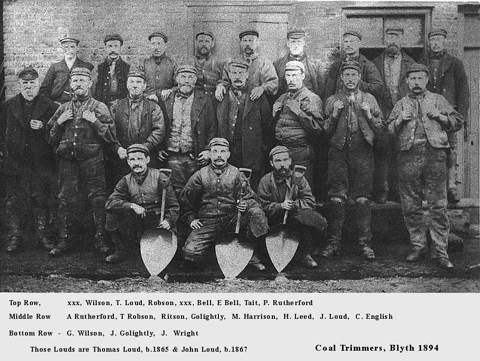 Here are a couple of photographs from 1894 taken of people who worked on the River Blyth. They were "Trimmers", the men who levelled the coal that had been "teemed" into holds of colliers. My thanks & appreciation to the photographer and the guys who preserved the photos. ![]() The Thomas Loud was my great-grandfather, and John Loud his brother. |