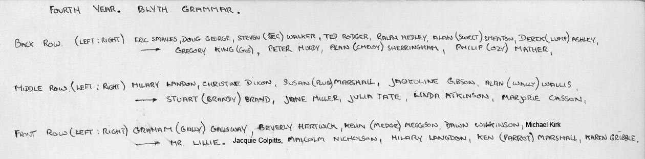 ![]() Blyth Grammar School, 1968, Fourth Form Pam Hodgson; Maureen Gaughan; Virginia Wade; ?, Ray Walton; Alan Bennett; ?; ?; Sheila McCullock/McCullough; Marian Wilson: ?; George Wallace; Irene Thompson; Harry Haggerty; ?; Alan Brown; ?; Albert Gurney; ?; Ian Hogg; Jan Douglas; David Ogle; Susan Dean; David Chicken; ?; Malcolm Rose; Pamela Tate; ?; Hugh Bowman; Carol Watson; Ken Baines; ?; Noel Clements; Marion Leask; |