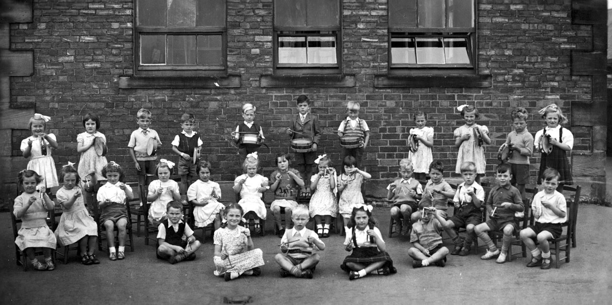 ![]() New Delaval Infants Class 2, Newsham, Blyth, 1951 That's me in the back row with a tambourine and an Elastoplast on my wrist. The drums in the middle were reserved for the petty middle class of Newsham. The kid with a suit was the son of a local shop-keeper, the kid on the right was the son of the manager of the local flee-pit cinema. |