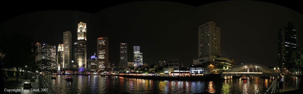 ![]() The Boat Quay, Singapore, 2007. The purpose of this and the next photo was to show the location of Riverwalk Apartments, to the right of the middle, (where a friend has an apartment, at which I was staying), not the business district or the Boat Quay restaurants. This picture was taken while testing a new lens on a second-hand digital camera that I bought in Singapore. This view, and the next, cover a field of about 270° . |